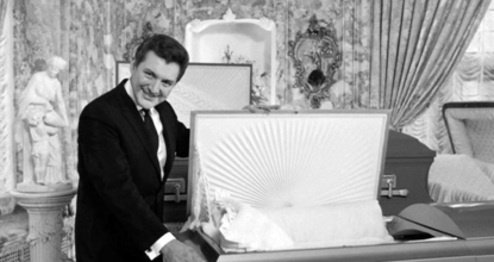 And a gold memorialised ‘casket key.’ And he wanted a full funerary cortège, which includes multiple flower cars, late model Cadillac Hearse, (I prefer our Rolls Royce ones here in old Blighty!), and police motorcycle escorts. And he added, with a flair, that the chapel would include a moving slide pictorial, live music quartet, velour covered chairs at the graveside, a marbled grave liner, or vault, with bronze plating, and the casting of earth, during the service (ashes to ashes), to be done with a sterling silver repository and spade. And finally, the FD pulled out a ring binder and flipped to a page showing the catering options available for wakes. He says he insists on the ‘Eternal Rest Epicurean Platinum’ catering package which provides, during viewing hours, a medley of hors-d’oeuvre options, including jumbo prawns, crudités, Kosher canapés, and a Ferrero Rocher tier.