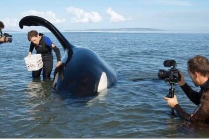 23 May 2013. Male orca stranded on Kaipara Harbour beach. The orca’s…