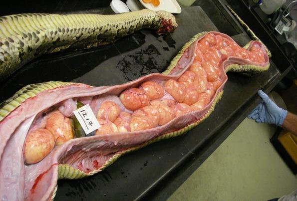 Here’s a 17-foot female with 87 eggs out of production.