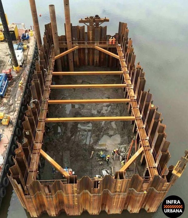 In the photo, we have a cofferdam made of metal sheets. They are driven into the bottom of the river/sea and the water is pumped out. If the soil is very permeable, a very large amount of water will continue to enter the bottom, and it will be necessary to continue pumping throughout the work.