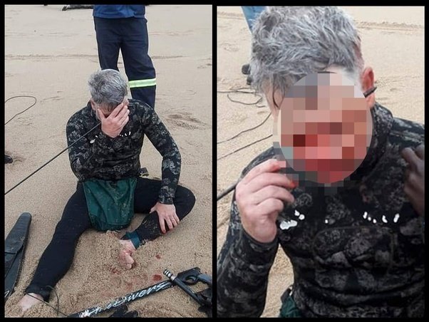 Despite the shock and pain, the diver managed to swim to the beach, where some people saw him and quickly called for help.