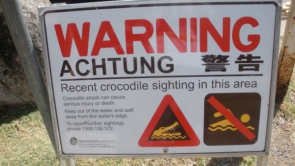 I live in Australia, which is famously full of animals that can kill you. This is of course exaggerated to folk lore status. However..there is one serious danger which should never be underestimated…..do not ever swim in rivers in the Top End. There are warning signs everywhere, They are usually a simple very obvious pictogram, but frequently look like this