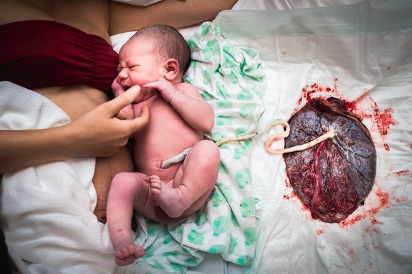 The mother will then deliver the placenta, which now hangs off the baby like a lump of meat.
