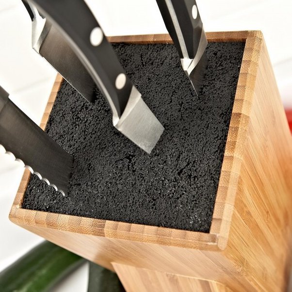 Note that it has no slots. It’s actually just a wooden box filled with very slender nylon rods. You can stick your knives in it in whatever position suits you. It won’t damage the knives and the knives won’t damage it. The perfect knife block.