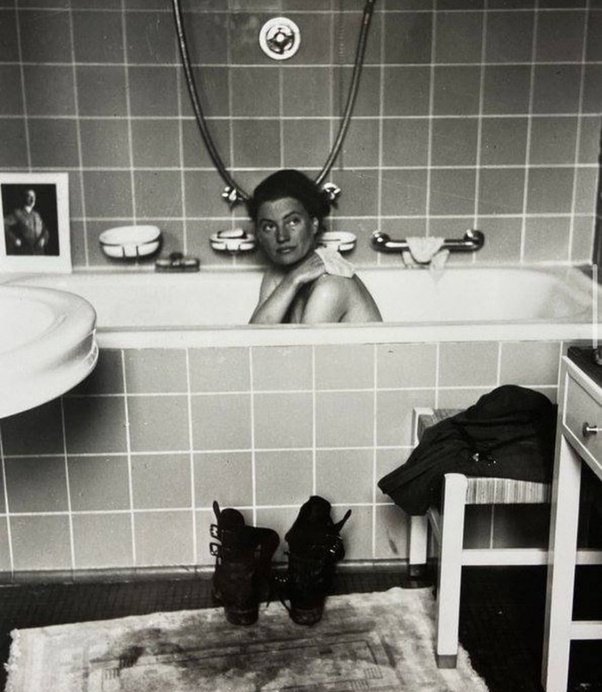 Look close, and you see her boots are very dirty on the bathmat. That dirt was the dirt of the battlefields and of places such as the Dachau concentration camp that she had just photographed. She carried all the horror to Hitler’s clean, private room. You can even see the picture of the dictator watching her from the side of the tub.