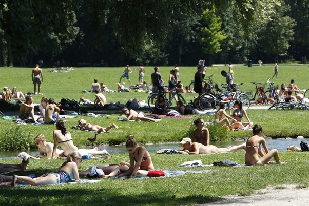 People sunbathing in whatever they feel comfortable wearing in Munich