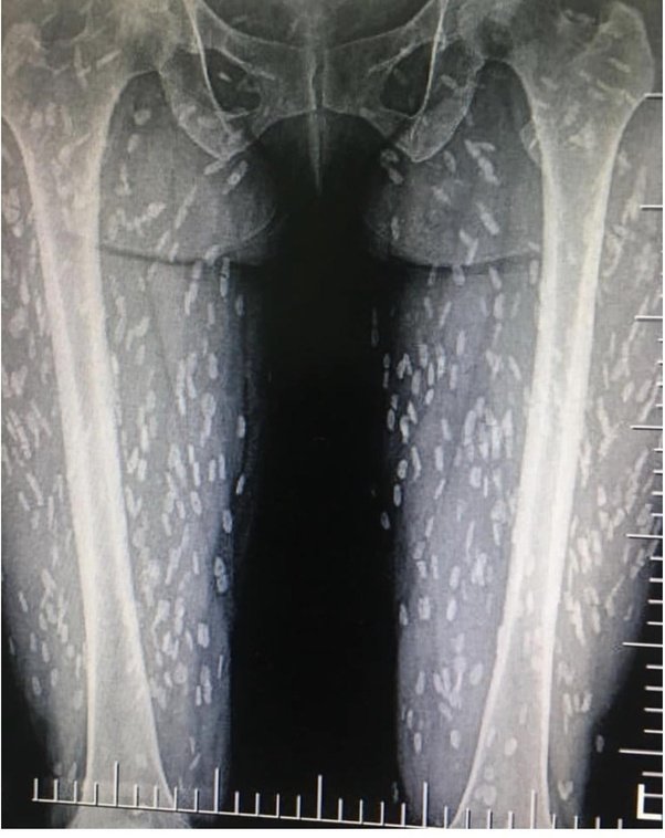 However, people still get infected in parts of the world where the pigs are not in a controlled environment. The white spots in the X-ray picture below are cysts of the parasite in an infected human.