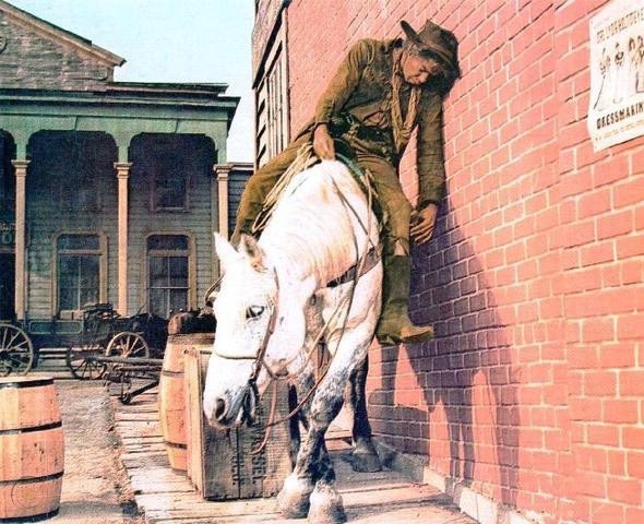 referring to the iconic shot in the film of Lee Marvin and the horse he’s on—-—both drunk——leaning against a wall.